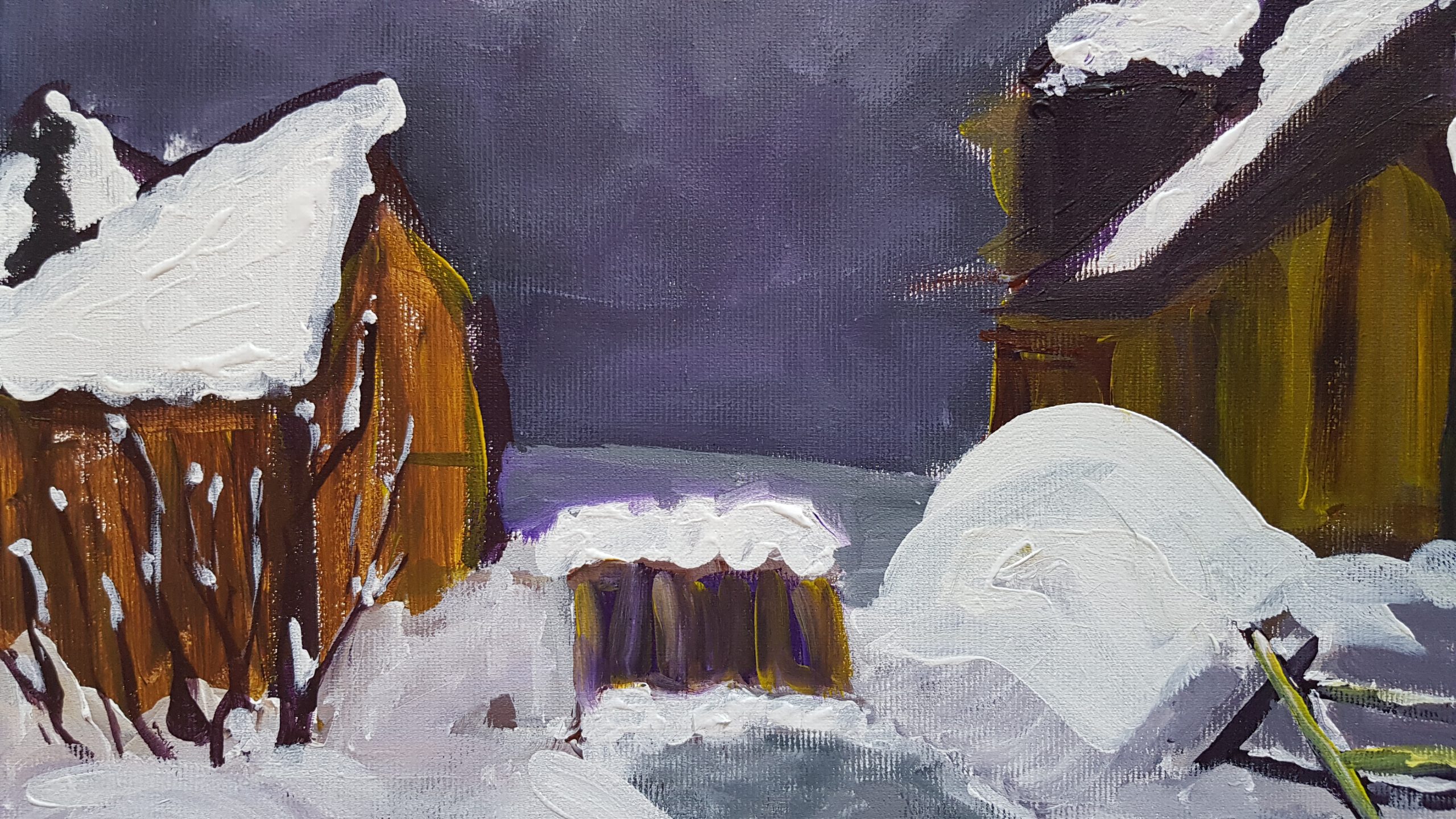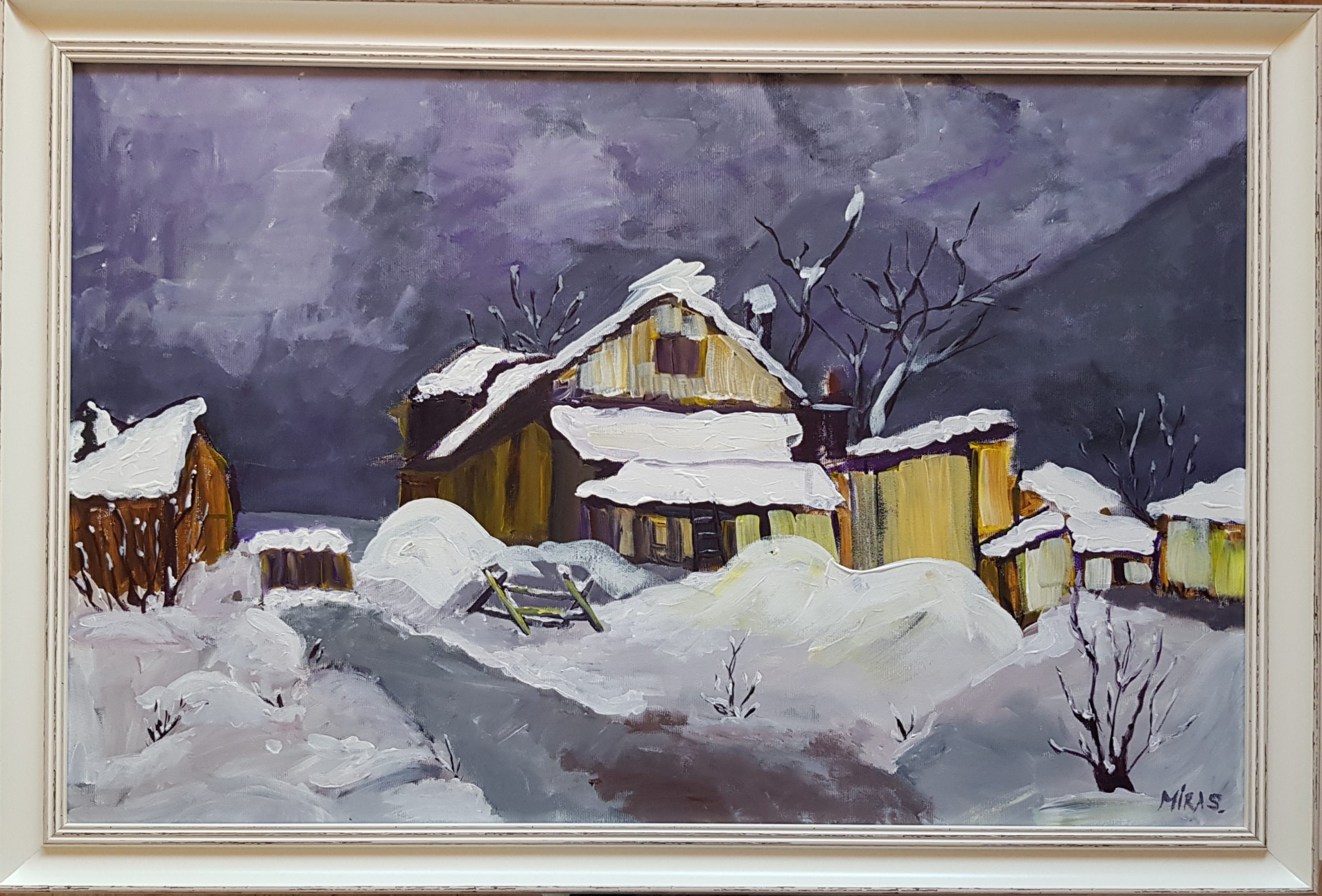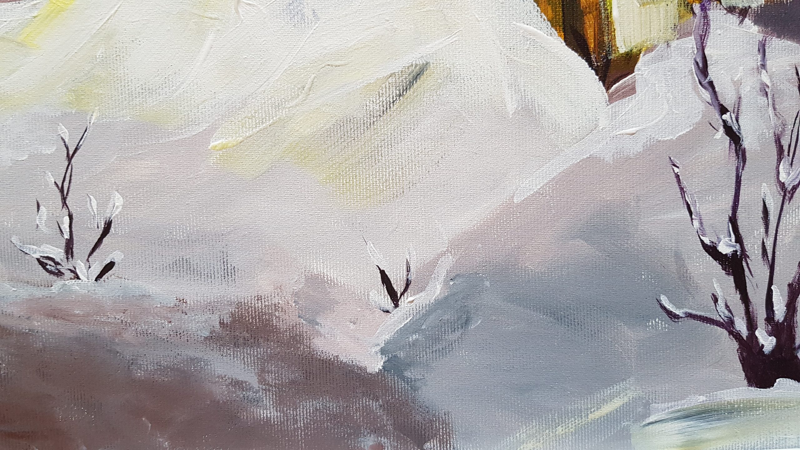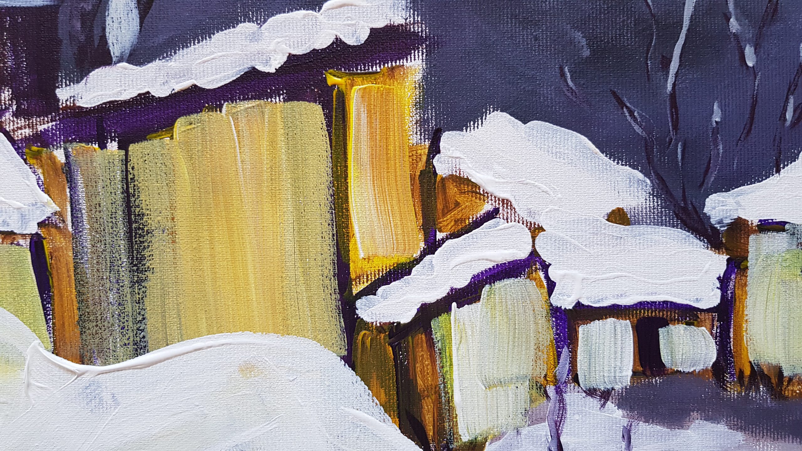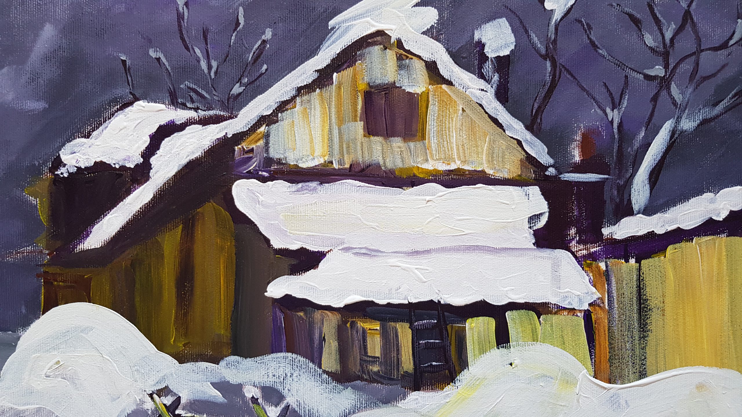 Tablou original pictat manual cu culori acrilice pe panza de bumbac. Reda iarna pe inserat intr-un mediu rural.